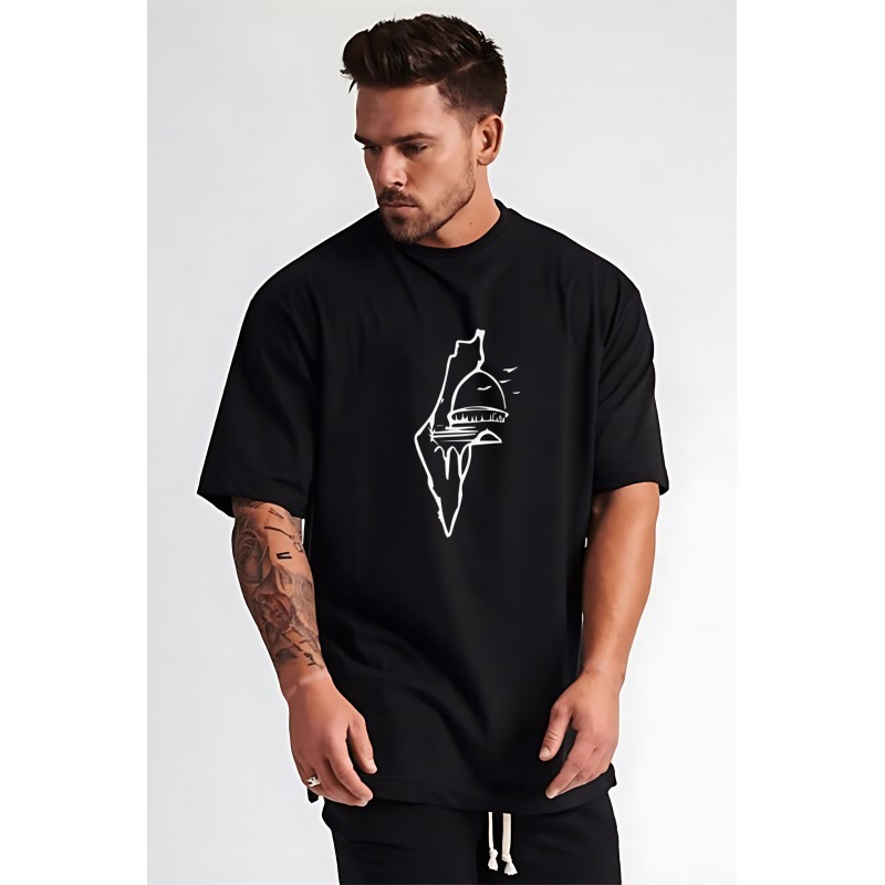 اللون الأسود اللافت يوفر تنوعاً، مما يتيح لك تنسيقه بسهولة مع الجينز أو الشورتات أو السراويل الرياضية. الميزة البارزة هي التصميم الجرافيكي الفريد على المقدمة - خريطة مفصلة لفلسطين مزينة بهيكل قبة أيقوني. هذه التمثيل الفني لا يضيف فقط لمسة جمالية بل يحتفل أيضاً بالهوية الثقافية.