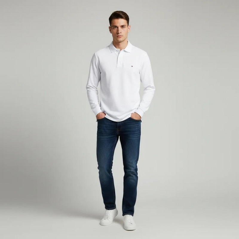قميص بولو أبيض كلاسيكي بأكمام طويلة