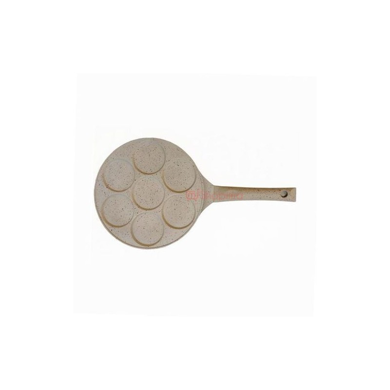 The utensil features a round, flat pan with seven shallow indentations, allowing you to cook multiple pancakes simultaneously. Each indentation is perfectly sized for standard pancakes, ensuring even cooking and optimal flavor absorption. Made from a light-colored, possibly non-stick material, this pan guarantees easy release of your pancakes while promoting even heating across the surface.