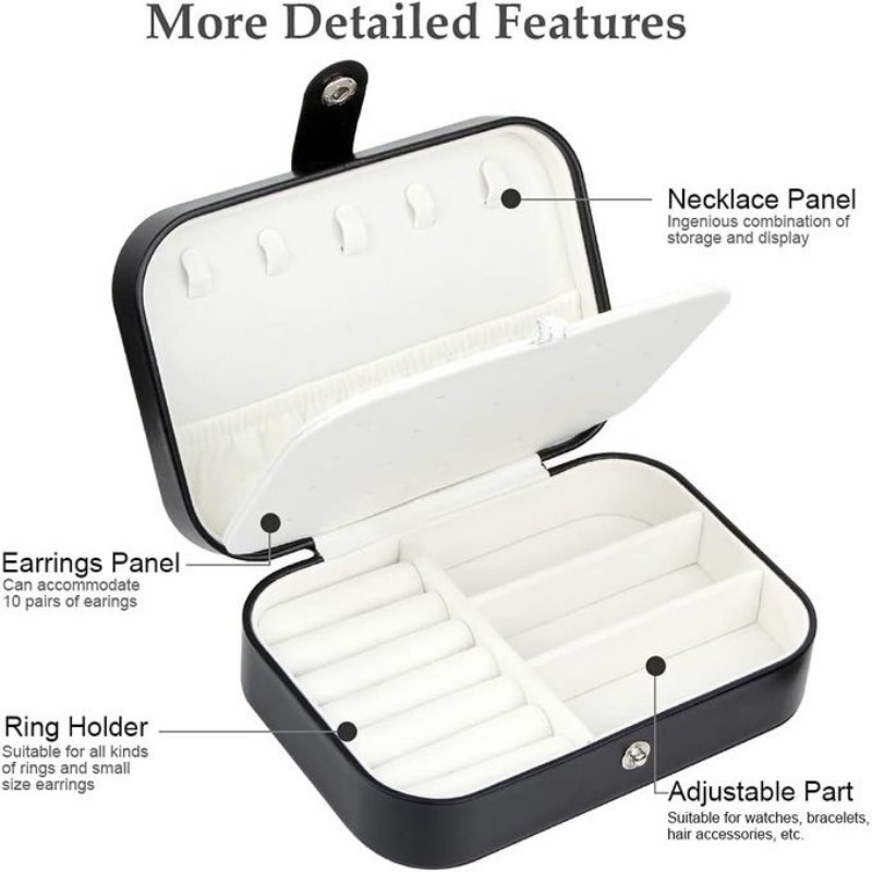 This elegant black jewelry organizer box is the ideal solution for storing all your precious pieces. With dedicated compartments for rings, earrings, and necklaces, this box ensures that your jewelry stays neat and tidy. The soft interior lining provides a gentle cushion to protect your valuables from scratches and damage. Compact and stylish, it’s perfect for both home storage and travel. The secure clasp closure ensures that your treasures are safe, making it a must-have accessory for any jewelry lover.