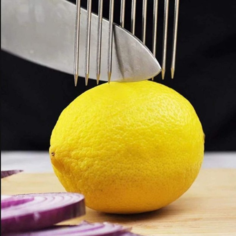 Ce presse-oignons en acier inoxydable est conçu pour rendre la découpe des oignons et des autres légumes un jeu d'enfant. Les dents aiguisées maintiennent l'oignon en place pendant que vous tranchez, garantissant des coupes uniformes et protégeant vos doigts. Parfait pour les chefs à domicile et les passionnés de cuisine.