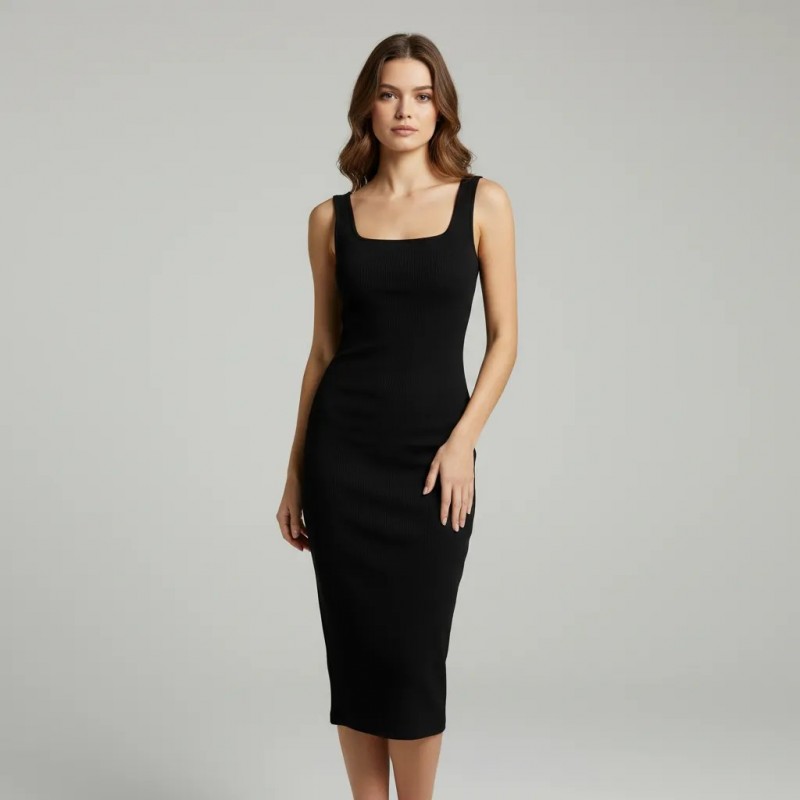 Cette robe midi noire élégante est conçue pour ceux qui apprécient le style classique et la sophistication. La robe présente une silhouette épurée et moulante avec un décolleté carré qui met en valeur votre forme naturelle. Fabriquée à partir de matériaux de haute qualité, elle offre à la fois confort et durabilité. Que vous assistiez à un événement formel ou à une soirée, cette robe est conçue pour vous faire paraître et vous sentir à votre meilleur. Associez-la à vos accessoires préférés pour un look complet et soigné.