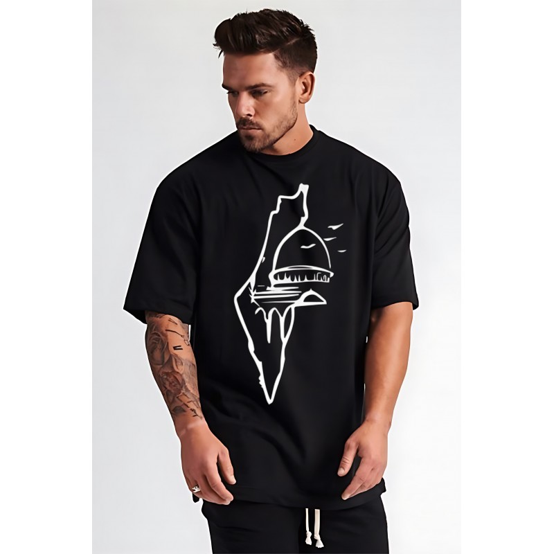 La couleur noire frappante offre polyvalence, vous permettant de l'associer facilement avec des jeans, des shorts ou des joggings. La caractéristique remarquable est le design graphique unique sur le devant : un contour détaillé de la carte de la Palestine orné d'une structure de dôme emblématique. Cette représentation artistique ajoute non seulement du style mais célèbre également l'identité culturelle.